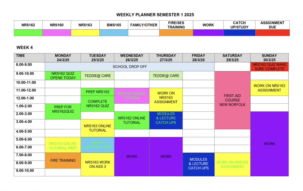 - I also add blocks for researching, drafting, and reviewing assignments, work shifts, volunteer training and courses, family time, and travel time to the mainland for nursing intensives.